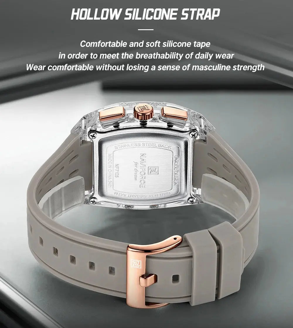 Equipped with a high-quality silicone band, the NAVIFORCE watch provides a comfortable fit for all-day wear. The soft material adapts easily to your wrist, which means you won't feel discomfort, even during extended use. The band is also easy to clean and maintain, making it a practical choice for those with an active lifestyle. Enjoy the ultimate blend of comfort and style with this exceptional timepiece.