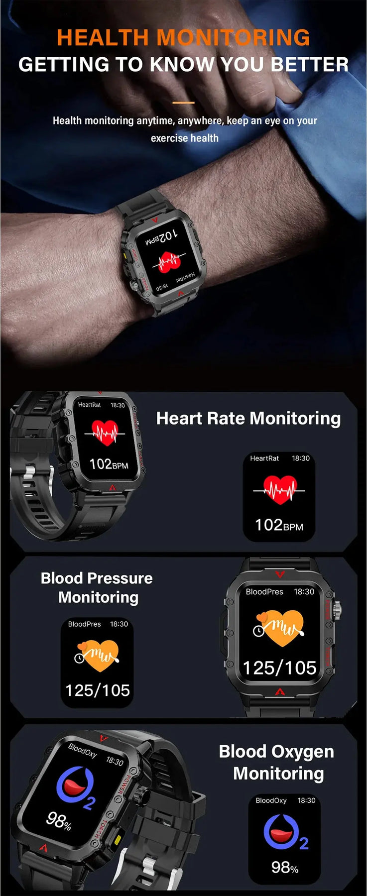This smart watch isn't just for fitness enthusiasts; it’s versatile for various outdoor activities including hiking, biking, or camping. With its built-in LED flashlight, navigating at night becomes effortless, ensuring you stay safe during adventures. Because it’s designed for outdoor use, the watch is also durable and water-resistant, making it a perfect companion for your adventures. This way, you can enjoy exploring nature without worrying about your gear.